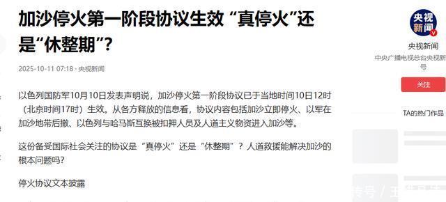 按照协议,哈马斯要把28具人质遗体全部交给以色列,因此他们的这个态度明显违反了协议。引发了以色列的强烈不满。 ——【·停火协议落地遇阻·】—— 加沙停火第一阶段协议的生效曾让中东局势透出微光。这份由美国、埃及、卡塔尔和土耳其四国联合担保的协议,于10月10日中午12时正式启动。协议文本明确约定,以军需在24小时内后撤至商定区域。72小时的人员交换期随之开启。