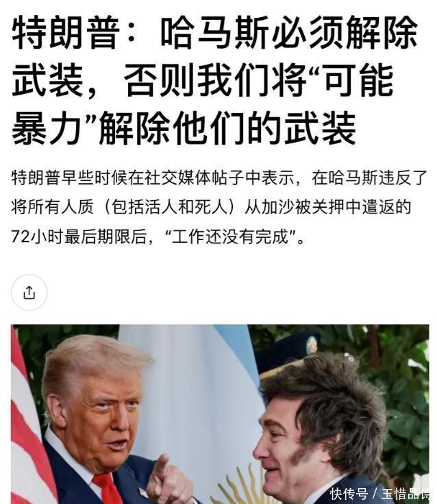 以色列的意图很明确。他们想用民生压力倒逼哈马斯就范。要求对方尽快交齐剩余遗体,完成协议约定。则抛出更核心的要求:哈马斯必须自行解除武装。以色列军方的表态带着警告意味,若对方拒绝,他们将亲自出手执行缴械。 ——【·特朗普撂狠话·】—— 作为担保国代表的特朗普,在14日打破了沉默。他在白宫与阿根廷总统米莱的会谈中公开表态,将矛头直指哈马斯。这位美国前总统声称已通过中间人向哈马斯传递了最后通牒。